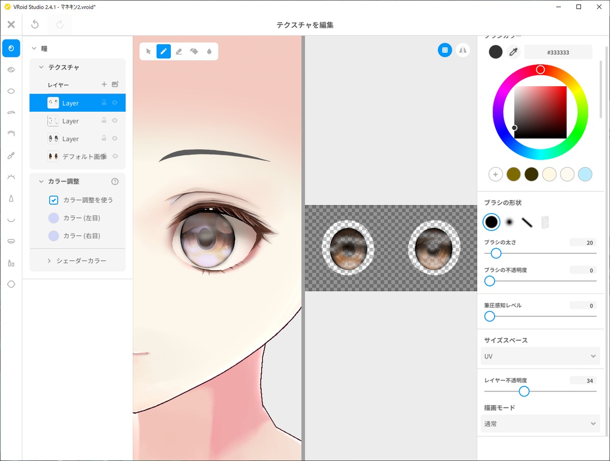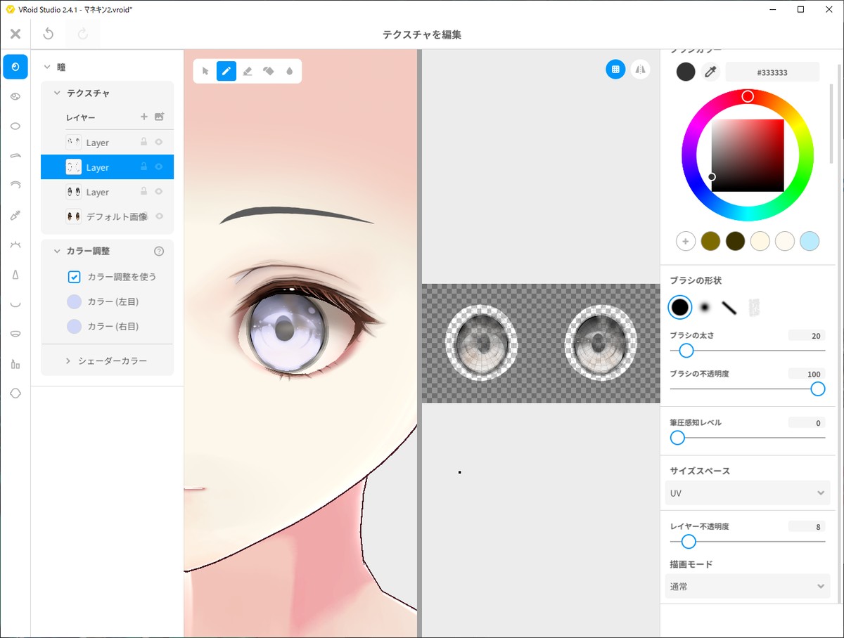 唐突にちょっとしたテクニック紹介。 瞳や髪のテクスチャは、適当に何枚か重ねて、透明度を変えるだけでも大分印象が変わるよ。